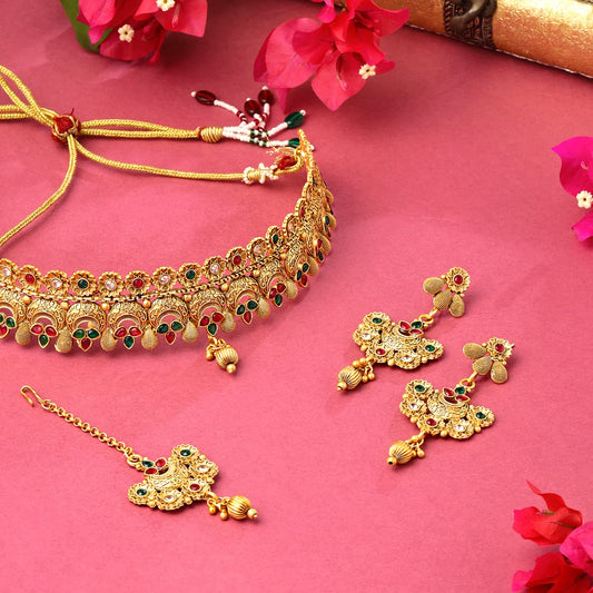 Jewellery Set For Women Gold Plated Crystal Studded Floral Designed Traditional Choker Necklace Set with Earrings and Mangtikka For Women and Girls