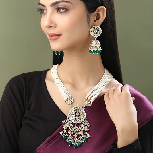 Jewellery Set for Women and Girls Traditional Kundan Necklaces Set | Gold Plated Moti Beads Beaded Green Pearl Drop Kundan Set | Birthday Gift for girls & women Anniversary Gift for Wife