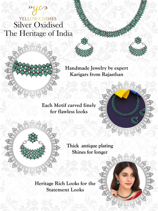 Jewellery Set for Women and Girls Traditional Silver Oxidised Jewellery Set Green Choker Set | Studded Stones Choker Necklace Set for Women | Birthday Gift For Girls and Women Anniversary Gift for Wife
