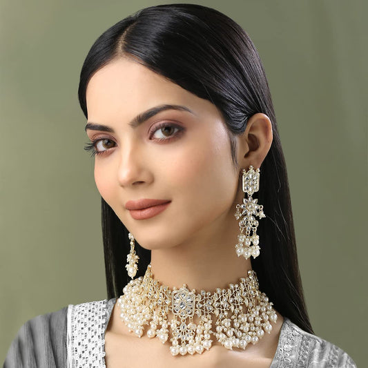 Jewellery Set for Women and Girls Traditional Kundan Necklaces Set | Gold Plated White Beads Drop Kundan Set | Birthday Gift for girls and women Anniversary Gift for Wife