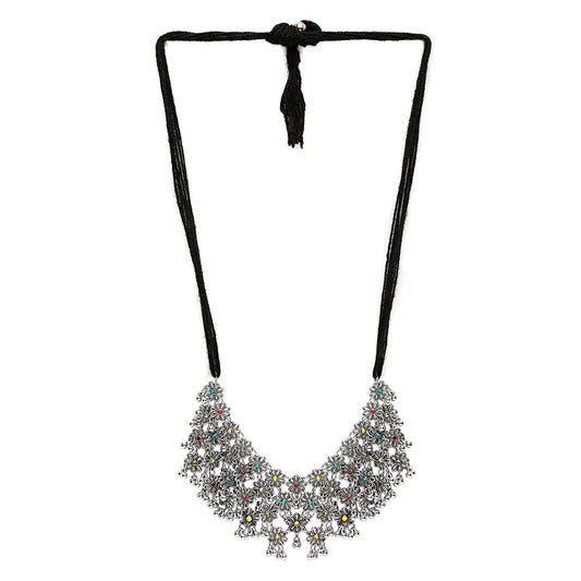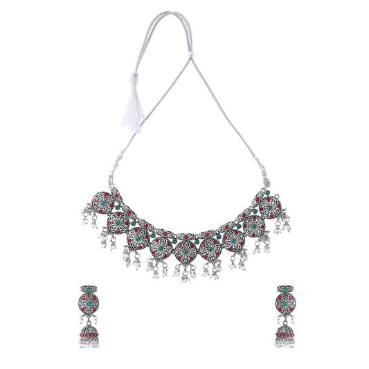Oxidised Jewellery Set for Women Silver Oxidised Jewelry Studded Multicolor Stoned Choker Necklace Set With Earrings for Women and Girls (Style 4)