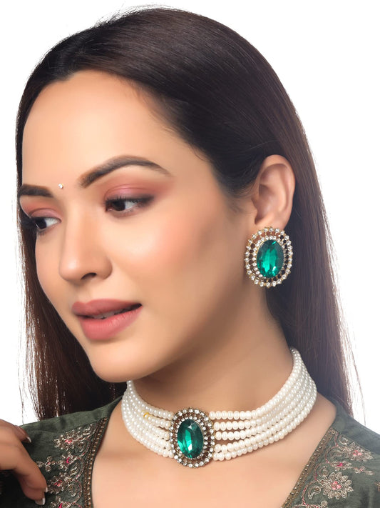 Jewellery Set for Women and Girls White Beads Necklace Set for Women | Gold Tone Green Crystal Choker Necklace Set | Birthday Gift for girls & women Anniversary Gift for Wife
