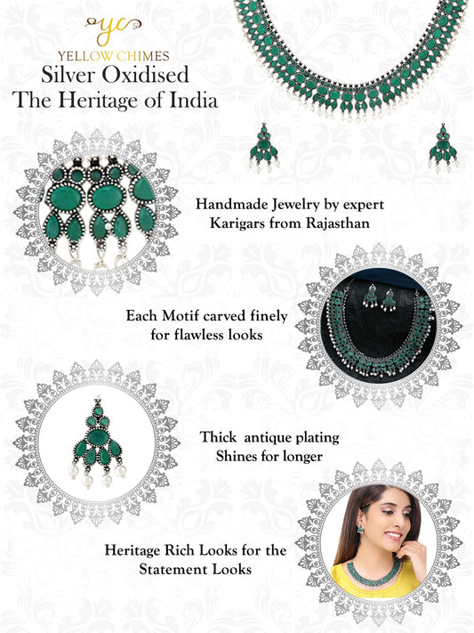 Jewellery Set for Women and Girls Traditional Silver Oxidised Jewellery Set Green Choker Set | Studded Stone Choker Necklace Set for Women | Birthday Gift For Girls and Women Anniversary Gift for Wife