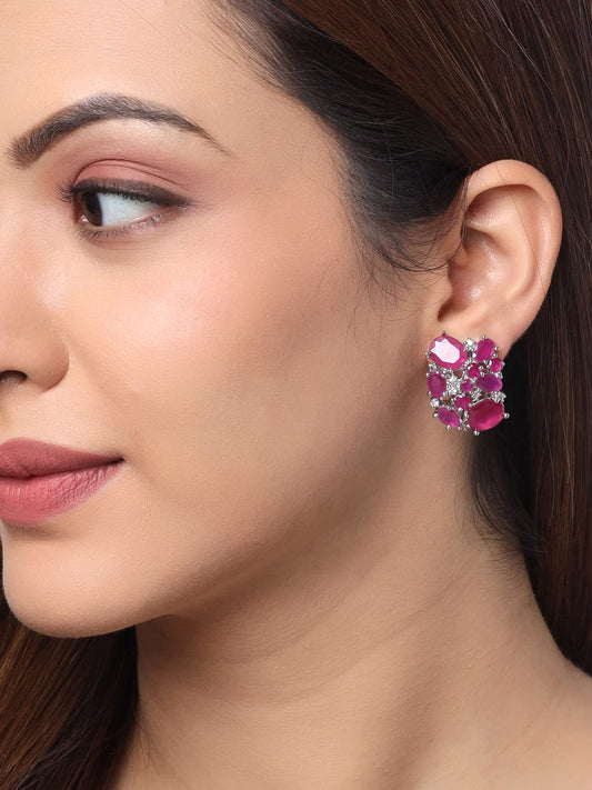 Earrings For Women Silver Toned Oval Pink Crystal Studded Clip On Elegant Stud Earrings For Women and Girls