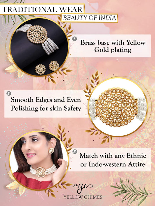 Ethnic Multilayer Pearl Beads Jewellery Set Traditional Choker Necklace Set for Women and Girls, gold, white, medium (YCTJNS-CKRPRL-WH)