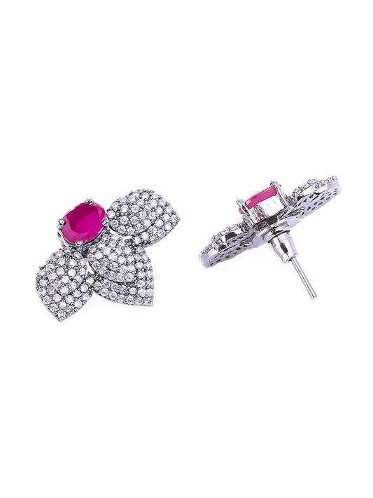 Classic AD/American Diamond Studded Black Rhodium Plated Pink Flower Stud Earrings for Women and Girls, Medium