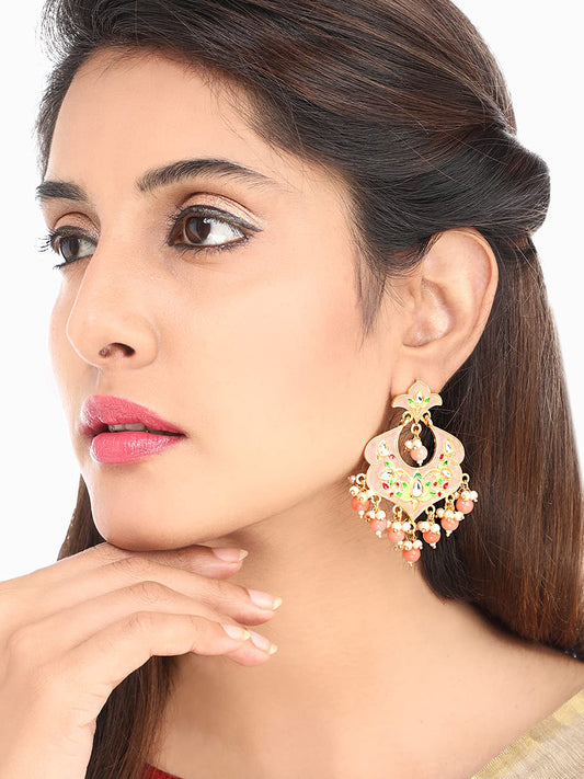Ethnic Gold Plated Traditional Beads Peach Meenakari Floral Design Chandbali Earrings for Women and Girls, Medium (YCTJER-99MNKFLW-PCH)