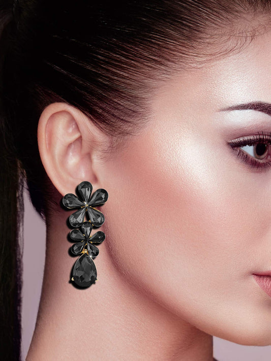 Elegant Sparkling Crystal Classic Dual Floral Design Dangle Earrings For Women And Girls (Black)
