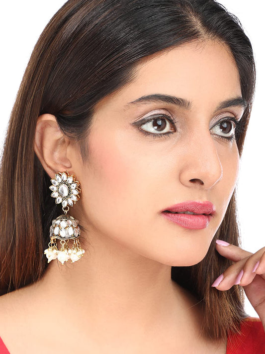 Ethnic Gold Plated Floral Design Traditional Stone Moti Beads Jhumka Earrings for Women and Girls, Medium (YCTJER-86BKFLWST-GL)