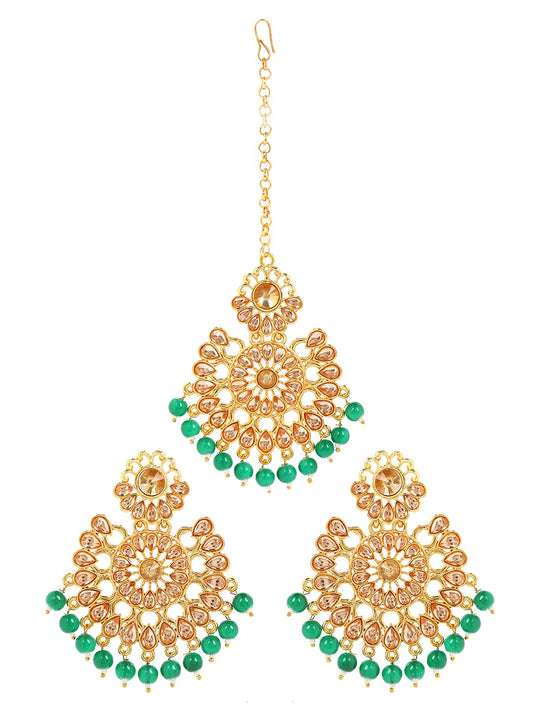 Ethnic Gold Plated Traditional Studded Kundan Green Pearl Chandbali Earrings with Maangtikka for Women and Girls, Medium, YCTJER-08FLWBDS-GR