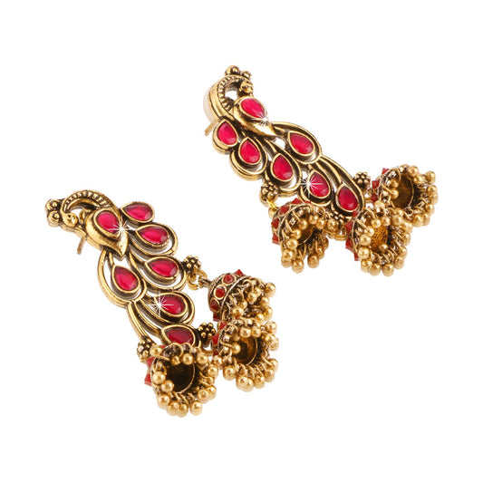 Red Stones Peacock Inspired Latest Trend Festive Oxidized Golden Traditional Jhumkas Earrings for Women and Girls