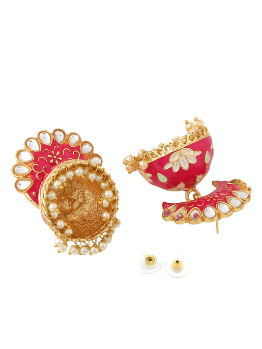 Earrings For Women Bright Pink Color Pearl and Stone Studded Meenakari Jhumka Earrings For Women and Girls