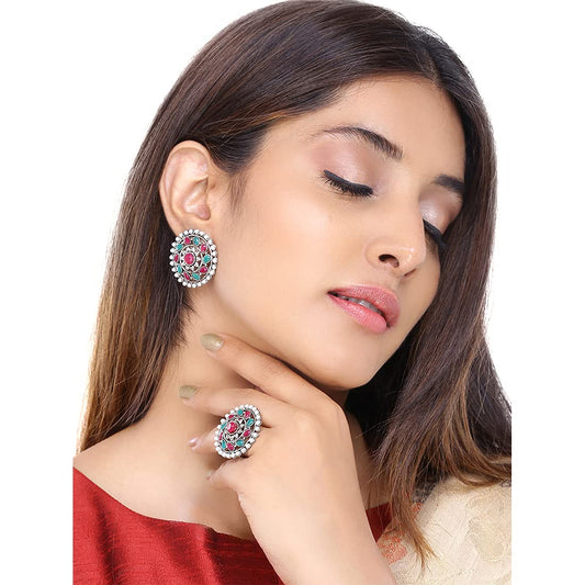 Ethnic German Silver Oxidised Multicolor Studded stones Round Traditional Stud Earrings and Ring Set for Women And Girls, Silver, Multicolor, Medium (YCTJER-89STNCIRST-MC)