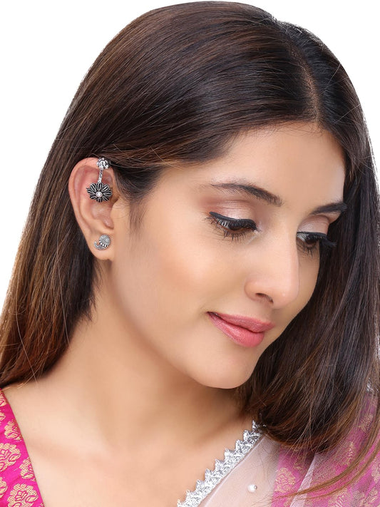 Oxidised Ear Cuffs for Women Combo of 3 Pairs Silver Oxidised Stud Earrings Floral Design Traditional Bugadi Ear Clip Earrings for Women and Girls.