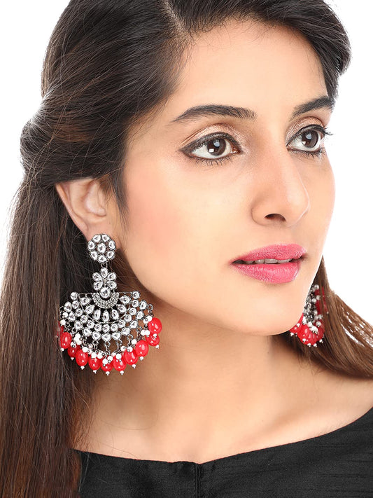 Ethnic Silver Oxidised Floral Design Kundan Studded Red Beads Chandbali Earrings for Women and Girls, Silver, Red, Medium (YCTJER-93BLKMTK-RD)
