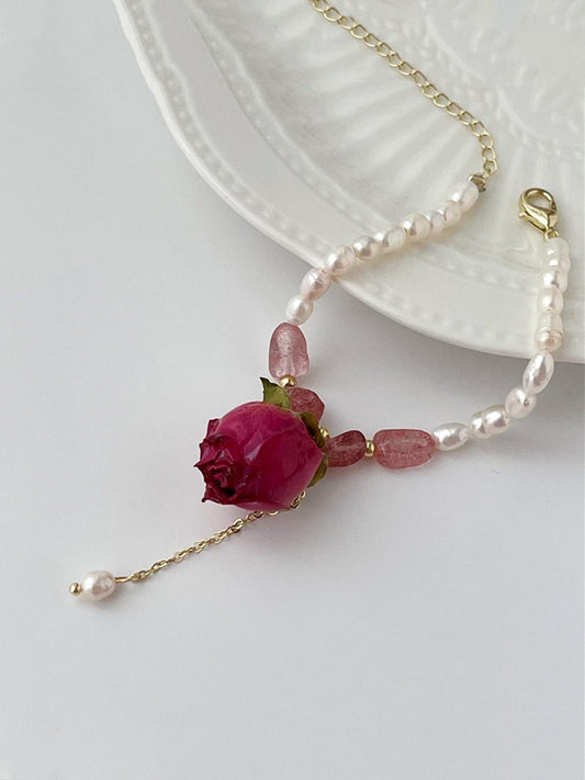 Bracelet For Women Gold Tone Pearl Beaded Pink Rose Charm Hanging Adjustable Bracelet For Women and Girls