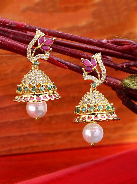 Classic AD/American Diamond Studded Pink Floral Design Pearl Drop Gold Plated Jhumka Jhumki Earrings for Women and Girls, Medium