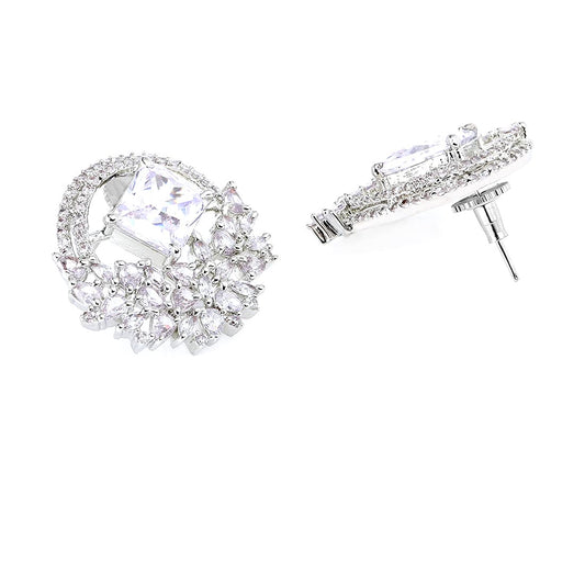 Classic AD/American Diamond Studded White Rhodium Plated Floral Stud Earrings for Women and Girls, Medium