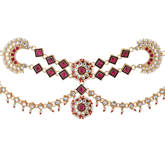 Maangtikka Daamini for Women Gold Plated Kundan Studded Meenakari Touch Multilayer White Beads Chain Designed Daamini Maangtikka for Women and Girls