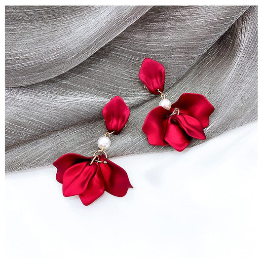 Floral Earrings for Women Gold Plated Metallic Red Colour Floral Petals Pearl Drop Earrings for Women and Girls