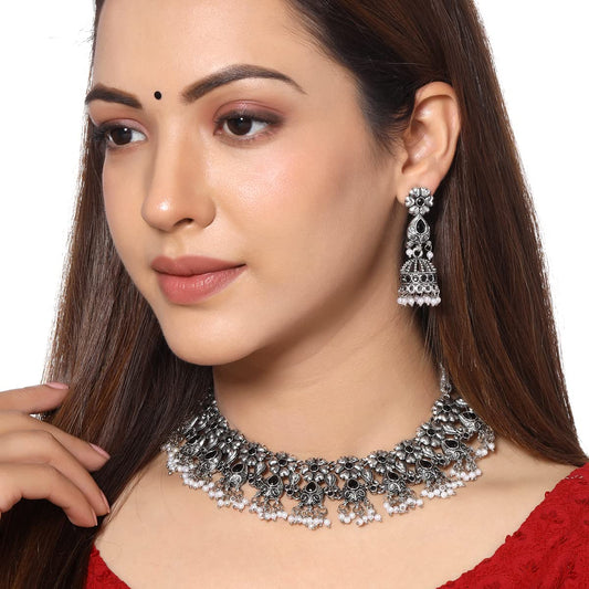 Jewellery Set For Women Silver Oxidised Black Stone Studded Floral Designed Pearl Beads Hanging Choker Necklace Set For Women and Girls