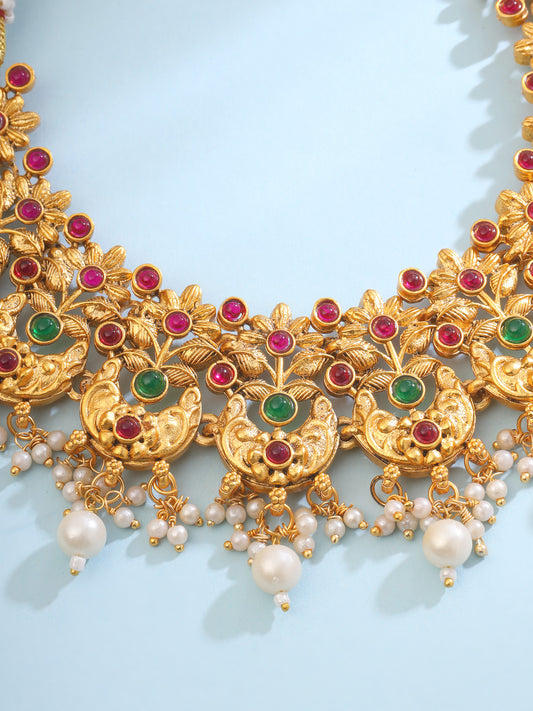 Jewellery Set For Women Gold Plated Pink and Green Stone Studded Pearl Beads Hanging Floral Designed Choker Necklace Set For Women and Girls
