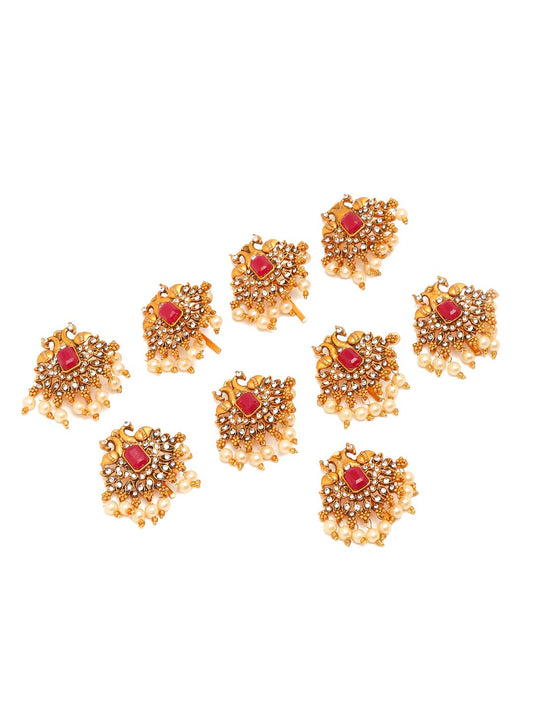 Jadai Billai for Women 9 Pcs Gold Plated Red Crystal Studded Beads Drop Choti Jadai Billai Hair Pin Bridal Hair Brooch Hair Jewellery for Women and Girls