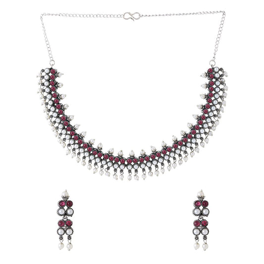 Jewellery Set for Womens Silver Oxidised Pink Stone Studded Pearl Drop Designed Coker Necklace Set for Women and Girls