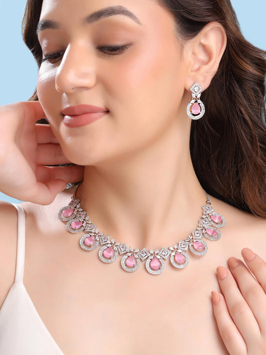 Diamond Necklace Set for Women | Pink Stone Silver Necklace Set | AD Jewellery Set for Women | Silver Diamond Necklace Set | Birthday Gift for Girls & Women Anniversary Gift for Wife