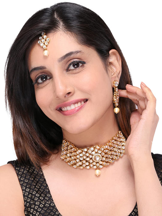 Kundan Studded Gold Plated Designer Choker Ethnic Traditional Choker Necklace Set With Maang Tikka Dangle Earrings by Gold Plated and Pearl Jewellery Set for Women (Golden)
