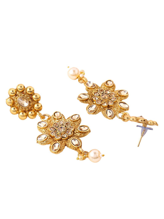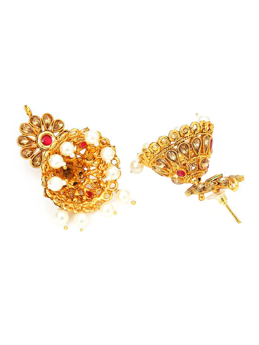 Ethnic Gold Plated Studded stones Flower Jhumka design Pearl Traditional Choker Necklace Set for Women and Girls, Medium (YCTJNS-67CKRPRL-GL)