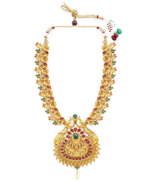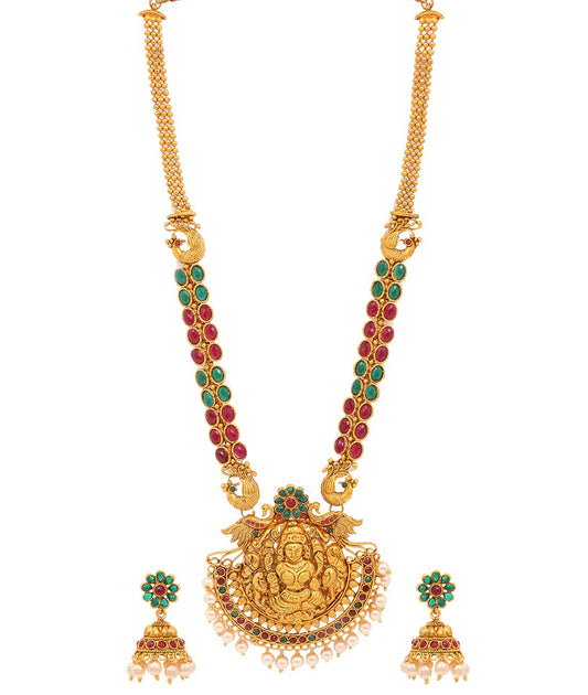 Women's Temple Traditional Gold Plated Long Haram Necklace Set Studded Stone Antique Jewellery Set