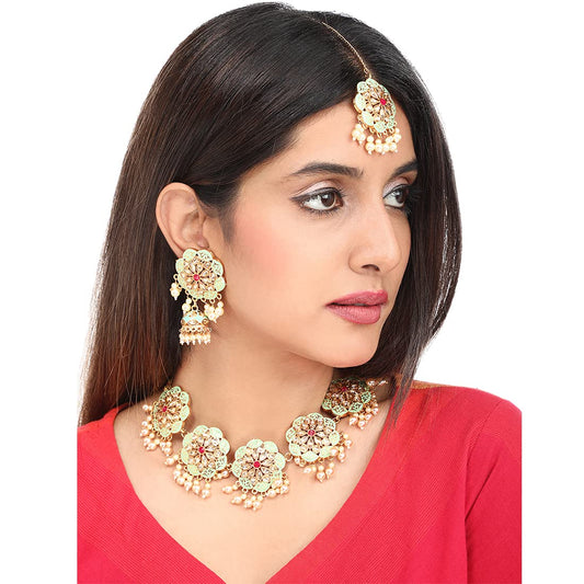 Traditional Jewellery Set for Women Gold-Plated Kundan Floral Choker Necklace Set With Maangtikka For Women and Girls