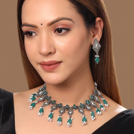 Jewellery Set for Women and Girls Choker Set for Women | Silver Tone Green Beads Drop Choker Necklace Set for Women | Birthday Gift For Girls and Women Anniversary Gift for Wife
