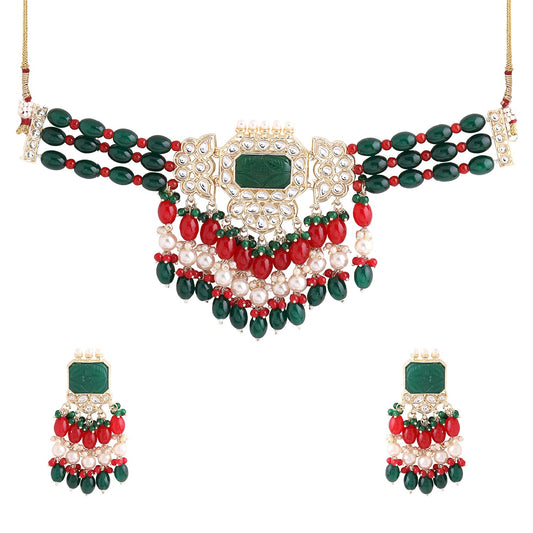 Jewellery Set for Women and Girls Kundan Necklace Set Gold Plated Kundan Studded Green Beads Beaded Choker Necklace Set | Birthday Gift for girls and women Anniversary Gift for Wife