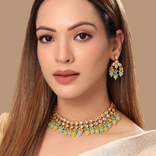 Jewellery Set for Women and Girls Kundan Necklace Set Gold Plated Kundan Studded Blue Beads Drop Choker Necklace Set | Birthday Gift for girls and women Anniversary Gift for Wife