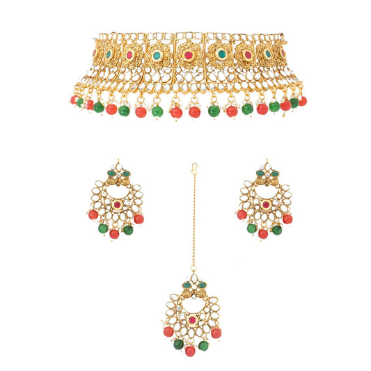 traditional necklace set for woman Gold-Plated Kundan Choker Necklace Set Traditional Kundan-Studded Beaded Necklace Set For Women & Girls