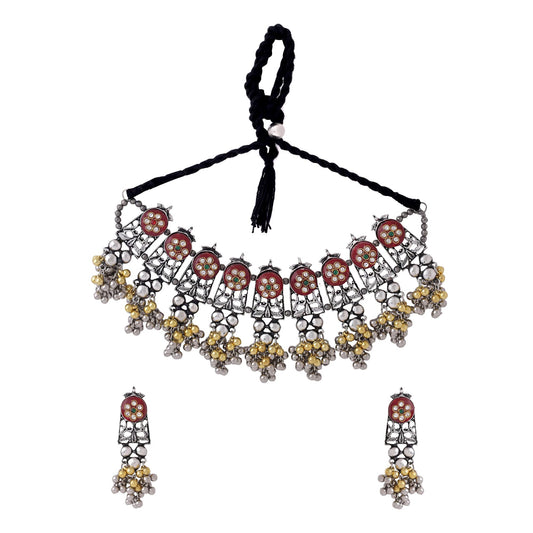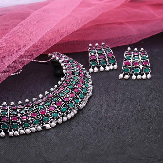 Jewellery Set for Women and Girls Traditional Silver Oxidised Jewellery Set | Multicolor Stone Choker Necklace Set for Women | Birthday Gift For Girls and Women Anniversary Gift for Wife