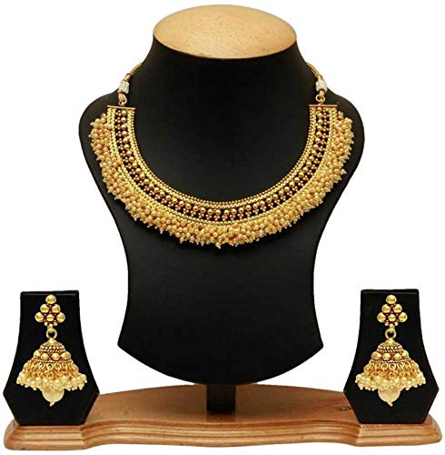 Exclusive Gold Plated Studded Pearl Antique Look Ethnic Traditional Choker Necklace Set with Jhumki/Jhumka Earrings Jewellery Set for Women and Girls