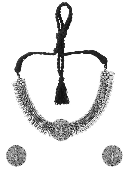 Classic German Silver Oxidised Jewellery Set Floral Crafted Traditional Choker Necklace Set for Women and Girls, medium (YCTJNS-01FLWROXD-SL)