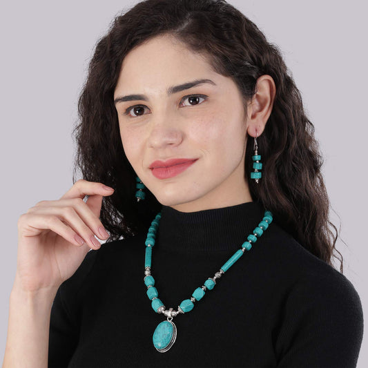 German Oxidized Silver Ethnic Green Turquoise Quartz Beads Beautiful Handmade Designer Necklace Set with Earrings Jewellery Set for Women and Girls (Green)