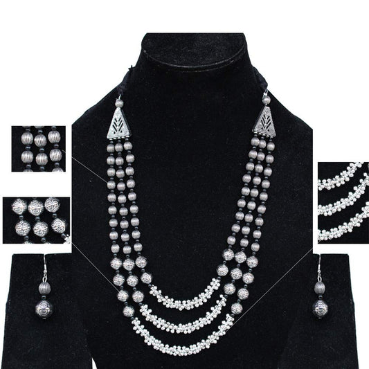 German Oxidised Silver Antique Beads Design Threader Traditional Layered Necklace Set with Drop Earring Jewellery Set for Women and Girls
