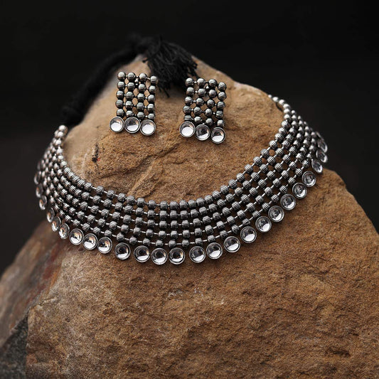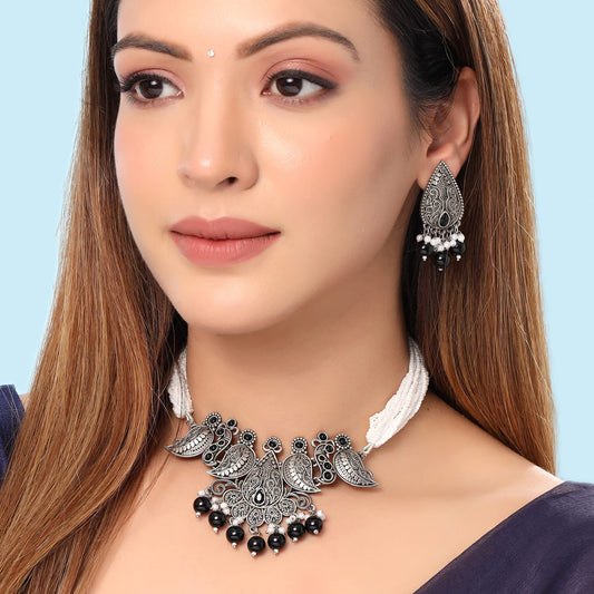 Classic German Silver Oxidised Jewellery Set Designer HandCrafted Traditional Choker Necklace Set for Women & Girls (White)