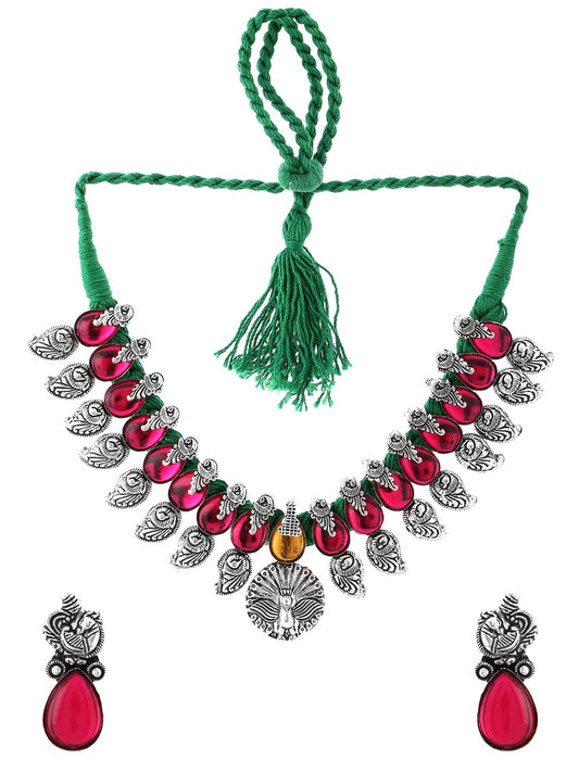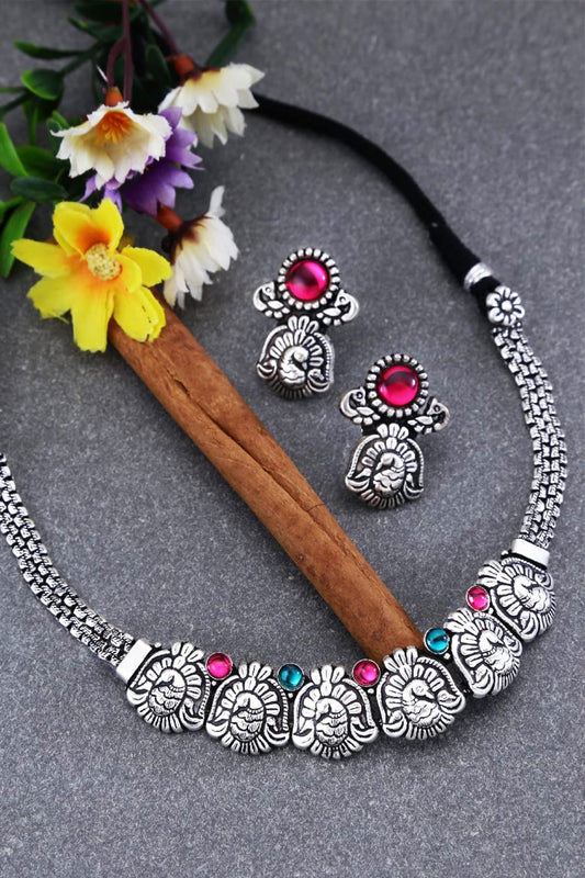 Oxidised Jewellery Set for Women Silver Oxidised Pink Studded Stones Choker Necklace Set for Women and Girls.