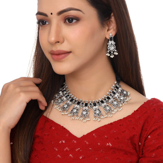 Jewellery Set for Women and Girls Silver Oxidised Jewellery Set | Pearl Drop Designed Choker Necklace Set for Women | Birthday Gift For Girls and Women Anniversary Gift for Wife