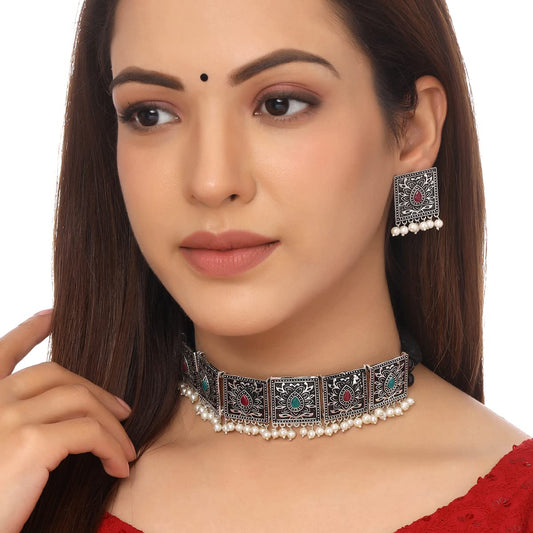 Jewellery Set For Women Silver Toned Square Designed Stone and Pearl Studded Eye-Catching Choker Necklace Set For Women and Girls