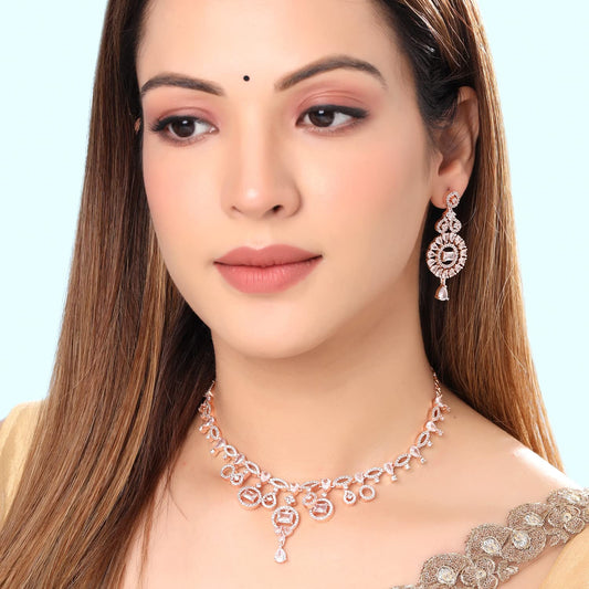 Jewellery Set for Women and Girls American Diamond Jewellery Set | Rose Gold Tone Drop Designed White AD Necklace Set | Birthday Gift for girls and women Anniversary Gift for Wife