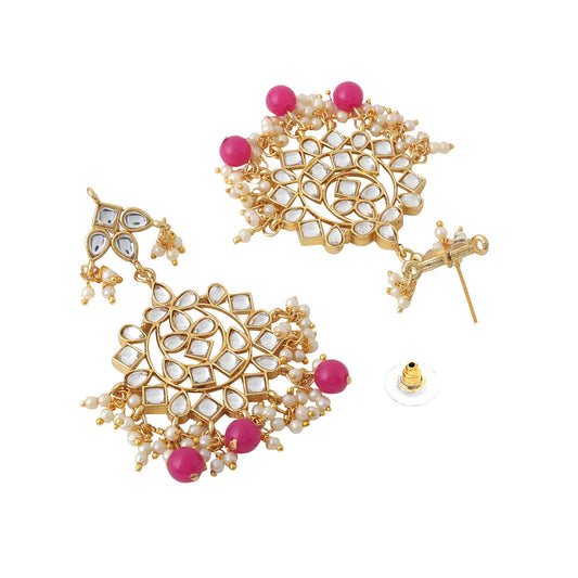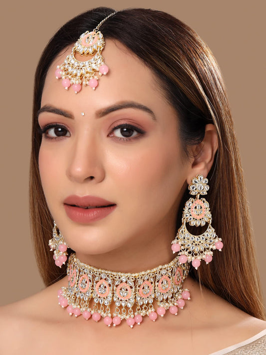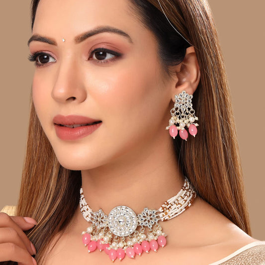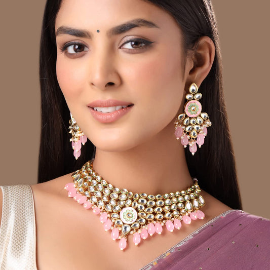 Jewellery Set for Women and Girls Kundans Necklace Set | Gold Plated Kundan Choker Pink Beads Drop Necklace Set | Birthday Gift for girls and women Anniversary Gift for Wife