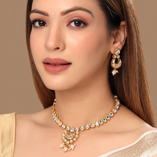 Jewellery Set for Women and Girls Kundan Necklace Set | Gold Plated White Beads Drop Kundan Choker Necklace Set | Birthday Gift for girls and women Anniversary Gift for Wife