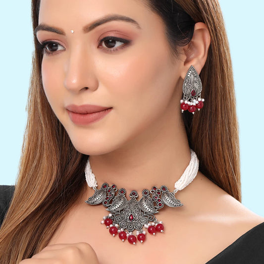 Jewellery Set for Women and Girls Silver Oxidised Necklace | Silver Oxidised Red Beads Drop Choker Necklace Set for Women | Birthday Gift For Girls and Women Anniversary Gift for Wife